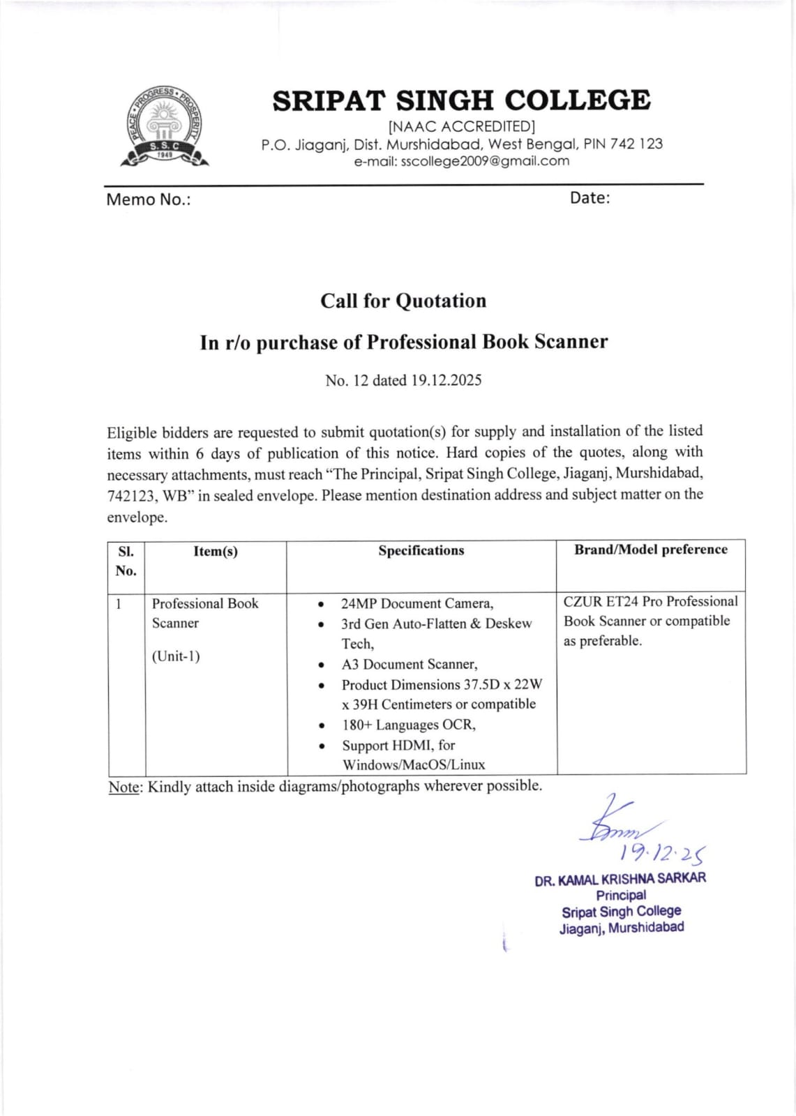 Tender Notice for Professional Book Scanner